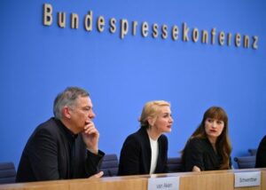 Germany’s left-wing party The Left (Die Linke) co-leader Ines Schwerdtner, Heidi Reichinnek and Jan Van Aken attend a press conference after the German general election in Berlin, Germany February 24, 2025. REUTERS/Annegret Hilse