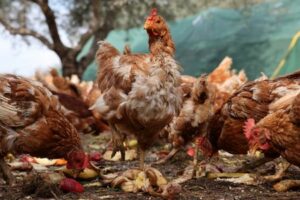 Retired hens are used to fertilise and mow olive groves,