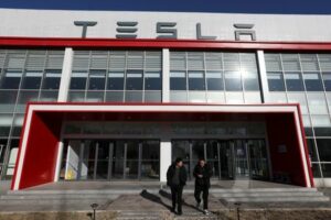 FOTO DE ARCHIVO: Un grupo de personas sale de un centro de reparto de Tesla en Pekín, China, el 8 de enero de 2025. REUTERS/Florence Lo/Foto de archivo