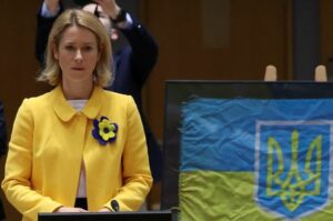 High Representative for Foreign Affairs and Security Policy and Vice-President of the European Commission Kaja Kallas stands for a minute of silence to mark the third anniversary of the war in Ukraine on the day of the European Union Foreign Ministers meeting in Brussels, Belgium, February 24, 2025. REUTERS/Yves Herman