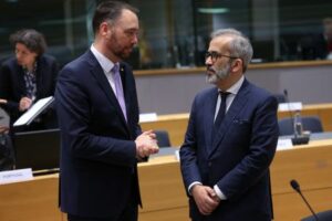 Belgium’s Deputy Prime Minister and Minister of Foreign Affairs, Maxime Prevot, and Portugal’s Minister of State and Foreign Affairs Paulo Rangel, look at each other on the day of the European Union Foreign Ministers meeting in Brussels, Belgium, February 24, 2025. REUTERS/Yves Herman