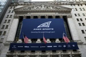 Amer Sports, (AS.N) parent company of sporting goods brands, banner hangs on the front of the New York Stock Exchange (NYSE) during the company’s IPO in New York City, U.S., February 1, 2024. REUTERS/Brendan McDermid/File Photo