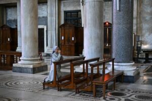 A nun prays in the Basilica di Santa Maria Maggiore, as Pope Francis continues his hospitalisation, in Rome, Italy February 28, 2025. REUTERS/Dylan Martinez