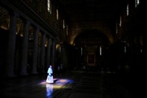 A priest walks in the Basilica of Saint Mary Major (Santa Maria Maggiore), as Pope Francis continues his hospitalization, in Rome, Italy February 28, 2025. REUTERS/Dylan Martinez