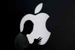 FILE PHOTO: A man check his phone near an Apple logo outside its store in Shanghai, China September 13, 2023. REUTERS/Aly Song/File Photo