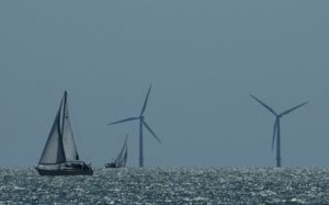 FILE PHOTO: A yacht sails in front of an offshore wind farm, seen from Walton-on-the-Naze, southern Britain, August 13, 2024. REUTERS/Toby Melville/File Photo