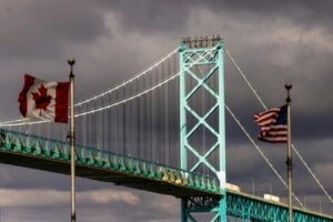 FOTO DE ARCHIVO. Banderas ondean cerca del puente Ambassador, que conecta Windsor, Ontario, en Canadá, y Detroit, Michigan, en EEUU, en Windsor, Ontario, Canadá. 4 de febrero de 2025. REUTERS/Carlos Osorio