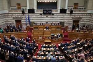 Greek Prime Minister Kyriakos Mitsotakis speaks at the Greek parliament, during a debate on a 2023 train crash that killed 57 people, in Athens, Greece, March 5, 2025. REUTERS/Louisa Gouliamaki