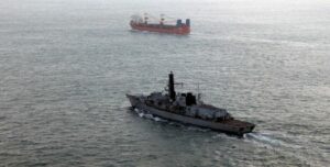 Royal Navy frigate HMS Somerset monitors merchant vessel Baltic Leader, which the Royal Navy said, was escorted by the Russia’s Boikiy warship through UK waters, as part of a 3-day operation, in this undated handout image. Royan Navy/Handout via REUTERS