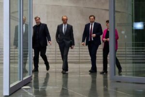 Friedrich Merz, Bundeskanzler und CDU-Vorsitzender, der bayerische Ministerpräsident und CSU-Vorsitzende Markus Söder und die SPD-Vorsitzenden Saskia Esken und Lars Klingbeil gehen nach den Koalitionsverhandlungen zu einer Erklärung in Berlin, Deutschland, 4. März 2025. REUTERS/Lisi Niesner