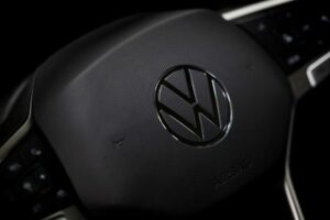 FILE PHOTO: A logo of Volkswagen is seen inside a car dealer in Nijmegen, Netherlands February 26, 2025. REUTERS/Piroschka van de Wouw/File Photo