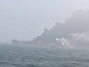 Fire and rescue service crews respond to a collision between oil tanker and a cargo ship off the northeastern coast of England in this picture obtained by Reuters on March 10, 2025. BARTOSZ SMIALEK/via REUTERS