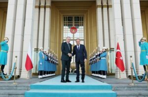 Turkey’s President Tayyip Erdogan welcomes Poland’s Prime Minister Donald Tusk at the Presidential Palace in Ankara, Turkey, March 12, 2025. Murat Cetinmuhurdar/Turkish Presidential Press Office/Handout via REUTERS