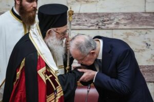 Greece’s new President Constantine Tassoulas Kisses the hand of Archbishop of Athens and All Greece, Ieronymos, during the swearing in ceremony at the Greek parliament in Athens, Greece, March 13 ,2025. REUTERS/Louisa Gouliamaki