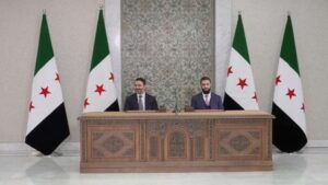 Syria’s interim President Ahmed Al-Sharaa looks on, as Syrian committee of legal experts submitted a constitution draft, in Damascus, Syria, March 13, 2025, in this screengrab obtained from a video. Syrian Presidency/Handout via REUTERS TV