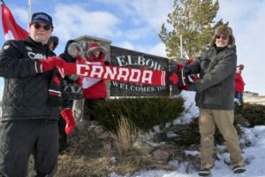 People take part in a “Elbows up” rally amid rising Canada-U.S. tensions on the back of tariffs imposed by U.S. President Donald Trump, in Elbow, Saskatchewan, Canada, March 14, 2025. REUTERS/Nayan Sthankiya
