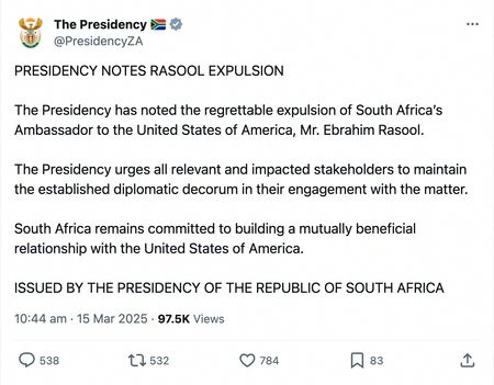 In statements from its presidency and international relations department, South Africa called the move regrettable but said it remained committed to building mutually beneficial relations and would address the matter via diplomatic channels.
