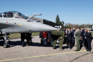 Frankreichs Präsident Emmanuel Macron steht während seines Besuchs auf dem Luftwaffenstützpunkt Luxeuil-Saint-Sauveur mit Mitgliedern und Piloten der französischen Luft- und Raumfahrttruppe (Armee de l’air et de l’espace) neben einem Kampfflugzeug vom Typ Dassault Rafale, Frankreich, 18 März, 2025. Ludovic Marin/Pool via REUTERS