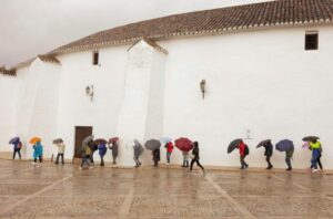 Tourists use umbrellas to cover themselves from a heavy rain and high winds, while they tour the city centre outside the bullring, as storm Konrad hits Spain, Portugal and France, in Ronda, Spain, March 13, 2025. REUTERS/Jon Nazca/File Photo