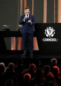 Fútbol – Copa Libertadores – Sorteo de la Fase de Grupos – Sede de la Conmebol, Luque, Paraguay – 17 de marzo de 2025. El presidente de la CONMEBOL, Alejandro Domínguez, habla durante el sorteo REUTERS/Cesar Olmedo