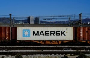 FILE PHOTO: Maersk container is transported by a train near a port of Barcelona, Spain April 26, 2024. REUTERS/Nacho Doce/File Photo