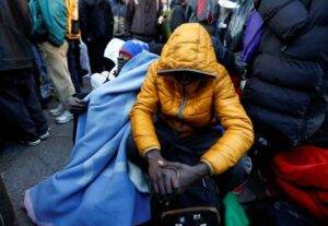 Migrants sit on the ground as people gather against police eviction of migrants from the Gaite Lyrique theatre after more than three months of their occupation, in Paris, France, March 18, 2025. REUTERS/Abdul Saboor