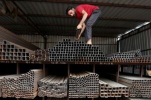 FILE PHOTO: A worker unload steel bars in a steel godown on the outskirts of Ahmedabad, India, January 31, 2025. REUTERS/Amit Dave/File Photo