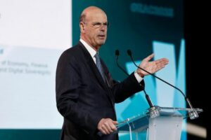 FILE PHOTO: French Minister for Economy, Finance, Industrial and Digital Security Eric Lombard delivers a speech at the Euronext stock exchange’s annual conference in Paris, France March 18, 2025. REUTERS/Benoit Tessier/File Photo