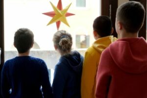 FILE PHOTO: Children look from the window at a nursery in Venice, Italy February 18, 2025. REUTERS/Manuel Silvestri/File Photo