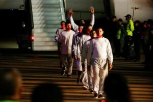 Migrantes venezolanos que volaron desde la Bahía de Guantánamo vía Honduras, caminan después de llegar en un vuelo de deportación al Aeropuerto Internacional Simón Bolívar en Maiquetía, estado de La Guaira, Venezuela, el 20 de febrero de 2025. REUTERS/Leonardo Fernández Viloria IMÁGENES TPX DEL DÍA