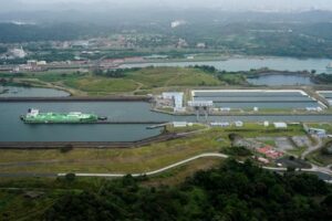 FOTO DE ARCHIVO. Vista aérea de un buque de carga transitando por las esclusas de Agua Clara en el Canal de Panamá, en Colón, Panamá, el 1 de febrero de 2025. REUTERS/Enea Lebrun