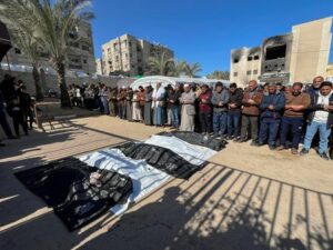 Dolientes rezan junto a los cuerpos de palestinos muertos en ataques israelĂes, en el hospital Nasser de Khan Younis, en el sur de la Franja de Gaza, 24 de marzo de 2025. REUTERS/Hussam Al-Masri