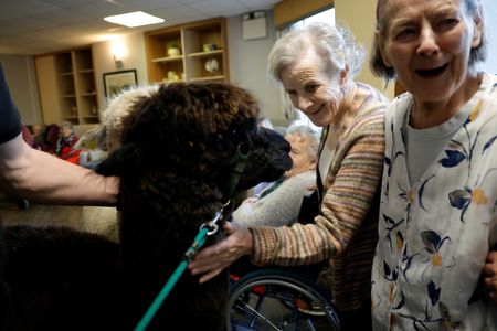 NEWTOWNMOUNTKENNEDY, Ireland (Reuters) – Flanked by a gaggle of smartphone-wielding onlookers, Irish farmer Joe Phelan ushered two alpacas down the corridor of a local nursing home as beaming residents waited their turn to pet them.