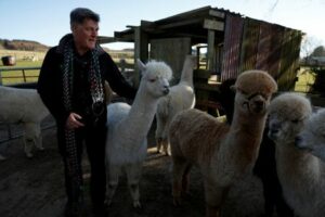 Owner and founder of K2Alpacas Joe Phelan interacts with his alpacas before putting a halter on some of them to take them for a walk on his alpaca farm, home to 71 alpacas which are used for agricultural tourism and therapy services, in Newtownmountkennedy, Ireland March 5, 2025. REUTERS/Clodagh Kilcoyne