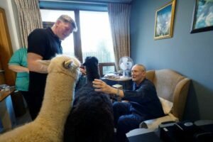 Oakfield nursing home resident Bryan Simons, 91, pets an alpaca called Stan as owner and founder of K2Alpacas Joe Phelan holds his lead during a therapeutic alpaca visit he provides for residents of care homes, in Courtown, Ireland March 14, 2025. REUTERS/Clodagh Kilcoyne