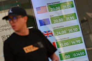 Imagen de archivo. Un tablero que muestra los tipos de cambio del peso mexicano frente al dólar estadounidense y otras monedas se muestra afuera de un banco, en Ciudad de México, México. 4 de marzo de 2025. REUTERS/Raquel Cunha