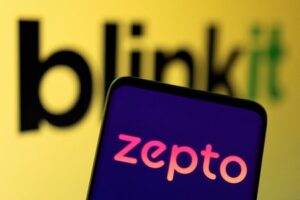 FILE PHOTO: Zepto logo is seen on smartphone in front of Blinkit logo in this illustration taken May 2, 2022. REUTERS/Dado Ruvic/Illustration/File Photo