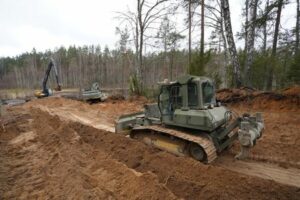 Digger and bulldozer operate at the site of rescue operation for a missing U.S. soldiers’ vehicle at Pabrade training ground, Lithuania, March 27, 2025. REUTERS/Janis Laizans