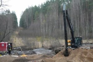 Digger operates as rescue service members search the site during a rescue operation for a missing U.S. soldiers’ vehicle at Pabrade training ground, Lithuania, March 27, 2025. REUTERS/Janis Laizans REFILE – CORRECTING DATE