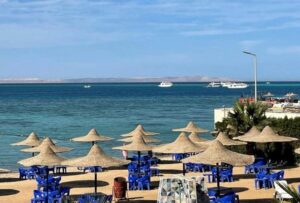 Ein leerer Strand ist neben dem Gebiet zu sehen, in dem ein Touristen-U-Boot vor dem Badeort Hurghada am Roten Meer gesunken ist. Ägypten, 27 März 2025. REUTERS/Stringer
