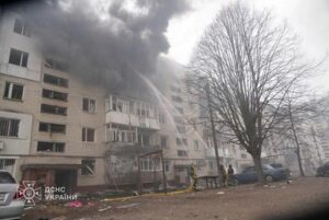 Firefighters work the site of an apartment building hit by a Russian missile strike, amid Russia’s attack on Ukraine, in Sumy, Ukraine March 24, 2025. Press service of the State Emergency Service of Ukraine in Sumy region/Handout via REUTERS