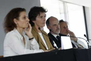 Los abogados del futbolista francés Kylian Mbappé -Delphine Verheyden, Frederique Cassereau, Thomas Clay y Pierre-Olivier Sur- ofrecen una rueda de prensa en el Hotel Pullamn Tour Eiffel, París, Francia. 10 abril 2025. REUTERS/Stephanie Lecocq
