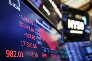 A screen shows trading indexes at the New York Stock Exchange (NYSE) in New York City, U.S., April 10, 2025. REUTERS/Jeenah Moon