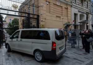 A vehicle carrying the American delagation arrives to the Russian Consulate where American and Russian delegations meet for a second time, to discuss stabilising bilateral embassy operations, in Istanbul, Turkey, April 10, 2025. REUTERS/Umit Bektas