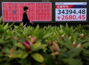 A woman walks past an electronic screen displaying Japan’s Nikkei share average outside a brokerage in Tokyo, Japan, April 10, 2025. REUTERS/Kim Kyung-Hoon