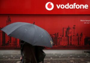 ARCHIV: Ein Mann benutzt einen Regenschirm, während er an einem Vodafone-Mobilfunkgeschäft in Liverpool, Großbritannien, vorbeigeht, 8. Oktober 2024. REUTERS/Phil Noble/ File Photo