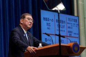 FILE PHOTO: Japan’s Prime Minister Shigeru Ishiba speaks during a press conference at the Prime Minister’s office on April 1, 2025 in Tokyo, Japan. Nicolas Datiche/Pool via REUTERS/ File Photo