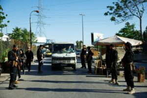 Fuerzas de seguridad sirias controlan un acceso a la ciudad de mayorĂa drusa de Jaramana, Siria. 5 mayo 2025. REUTERS/Yamam Al Shaar