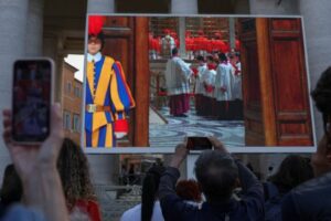 People gathered on St Peter’s Square watch a screen showing Cardinals in the Sistine Chapel, on the first day of the conclave to elect the new pope, at the Vatican, May 7, 2025. REUTERS/Amanda Perobelli