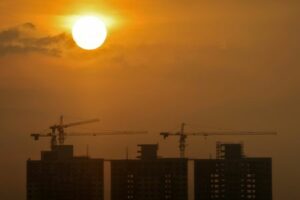 Construction sites of commercial buildings are seen as the sun